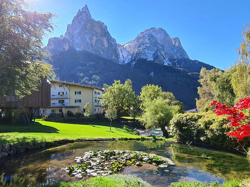 Our comfortable rooms are furnished in a modern or classic Tyrolean style and have a bathroom/WC, hairdryer, partially a balcony, flat screen TV, safe, vanity set, bathrobes and sauna towels and offer a unique vie over Schlern massif. Within our ¾-gourmet board, we offer a rich breakfast buffet, delicious snack in the afternoon as well as menus with several courses at dinner, accompanied by excellent wines. Relax in our spa oasis with sauna, steam bath, whirlpool and infrared cabin as well as in our 5,000 m² garden park with outdoor pool and inviting chill-out islands.